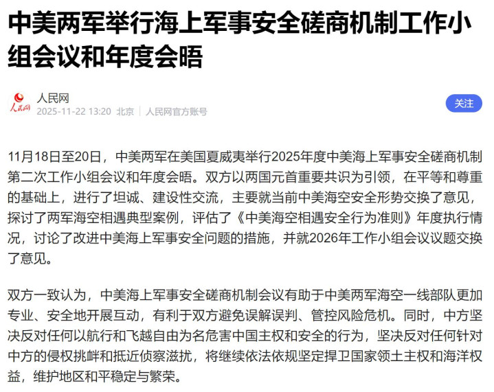 据人民海军最新消息,近期中美举行了海上军事安全磋商,重点讨论了两军海空相遇案例,沟通如何改进解决海上军事安全问题,双方一致同意沟通十分有效,有助于避免误解误判。